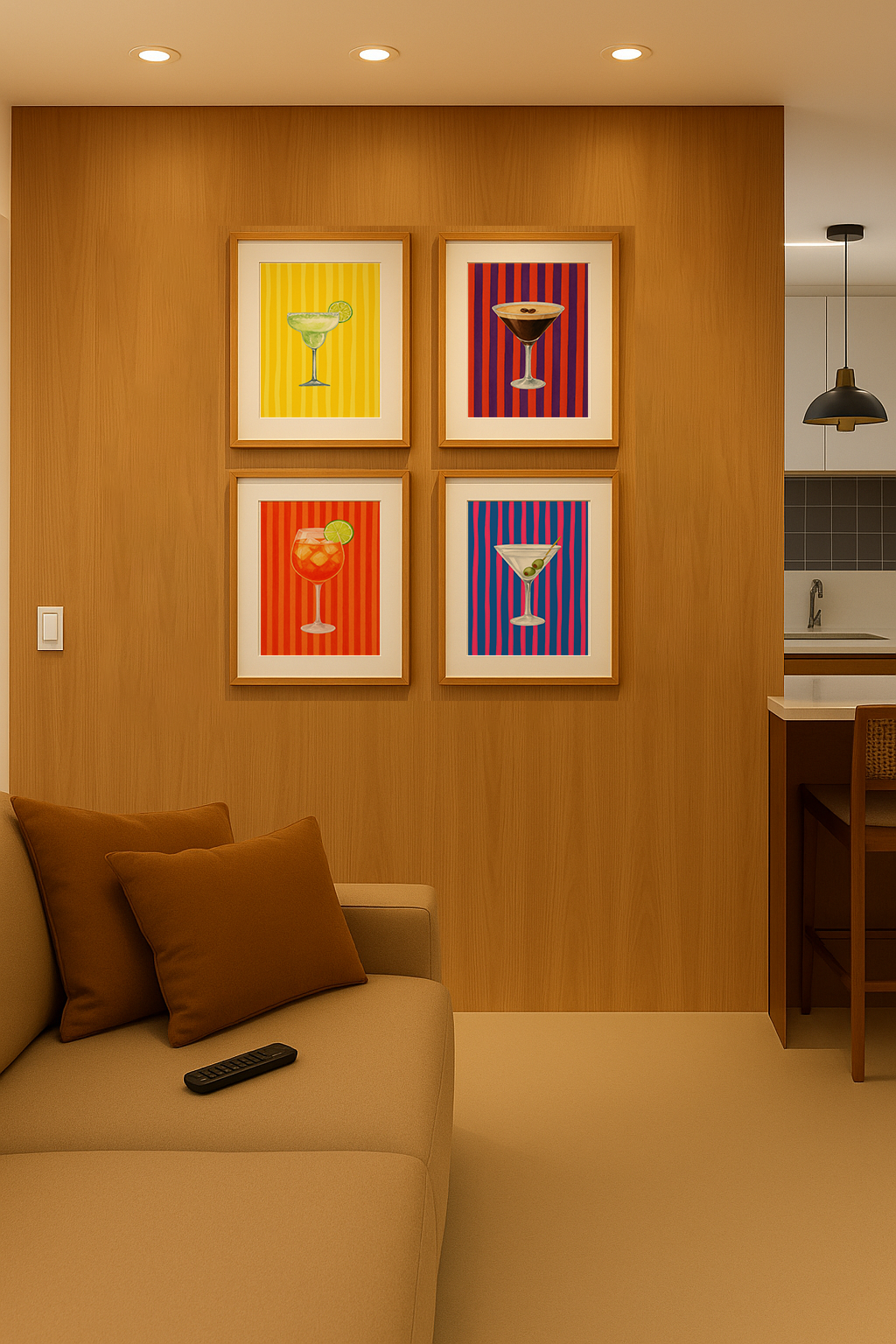 As cores contrastantes e molduras em madeira mel destacam cada arte, criando uma atmosfera festiva e moderna.