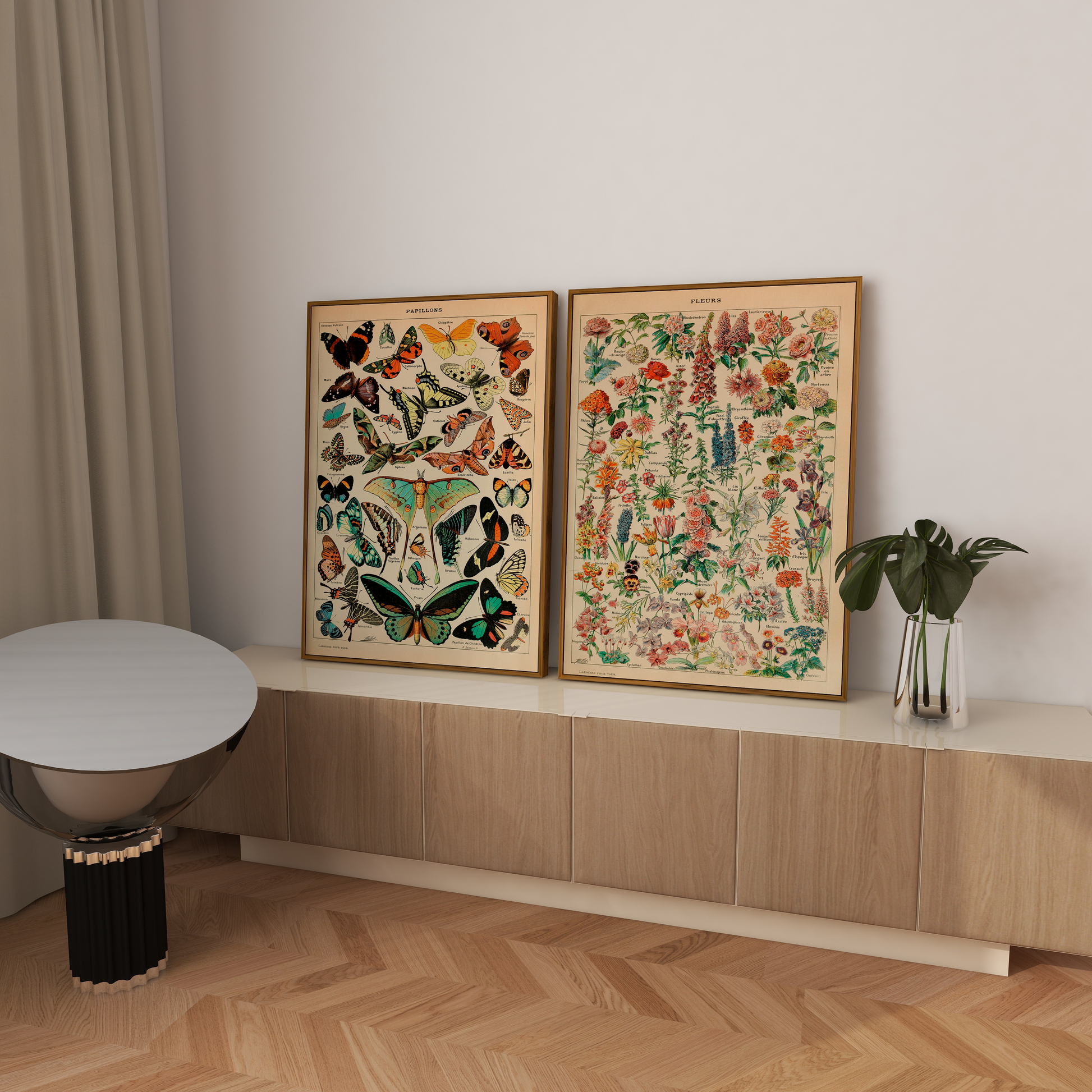 Composição de 2 quadros decorativos vintage com moldura filete.